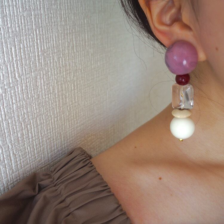ヴィンテージのピンクとグレーのマーブルパーツに赤をアクセントにいれた、ブリブリしすぎない少しだけラブリーなイヤリングです。