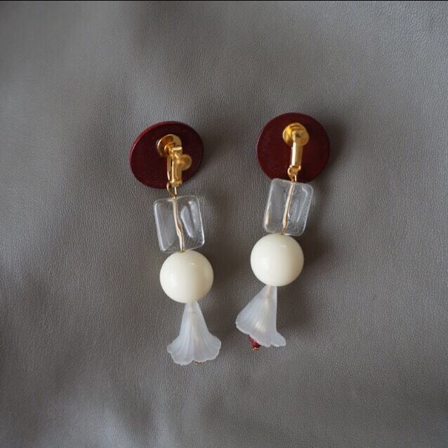 ドイツヴィンテージのレンガ色ウッドパーツにクリアビーズや、お花に見立てたすりガラスのビーズを合わせました。ゆらゆらくるくる回る大ぶりイヤリングとなってます。ハイネックやサッシュベルトを使ったシンプルコーデのアクセントに。お気に入りのうちの1つです。(^.^)