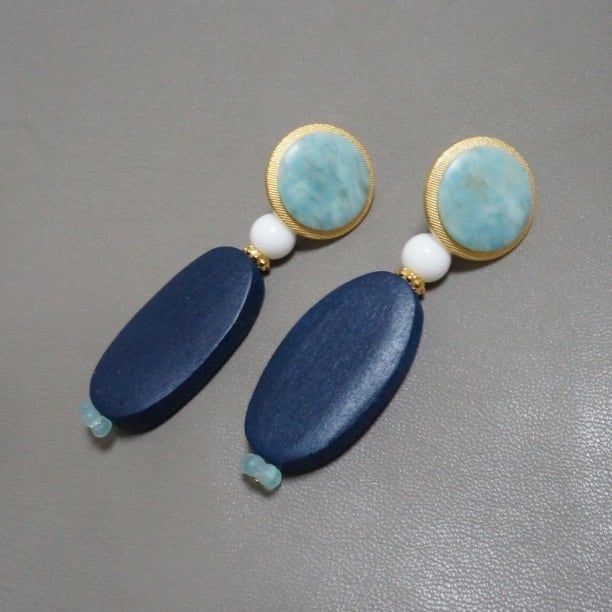 アンティークのブルーが色鮮やかなボタンをウッドビーズや現行品のビーズと合わせました。