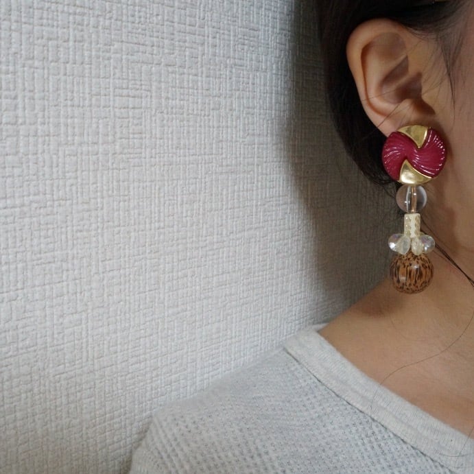 レッドとゴールドのアンティークパーツと、ヴィンテージビーズたちを合わせました。ウッドビーズがレオパードのようでレトロ感がありお気に入りです。